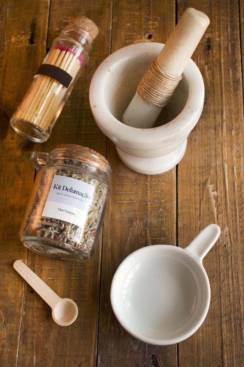 - 1 pote de vidro com ervas para defumação (Sálvia, Lavanda e Rosas)