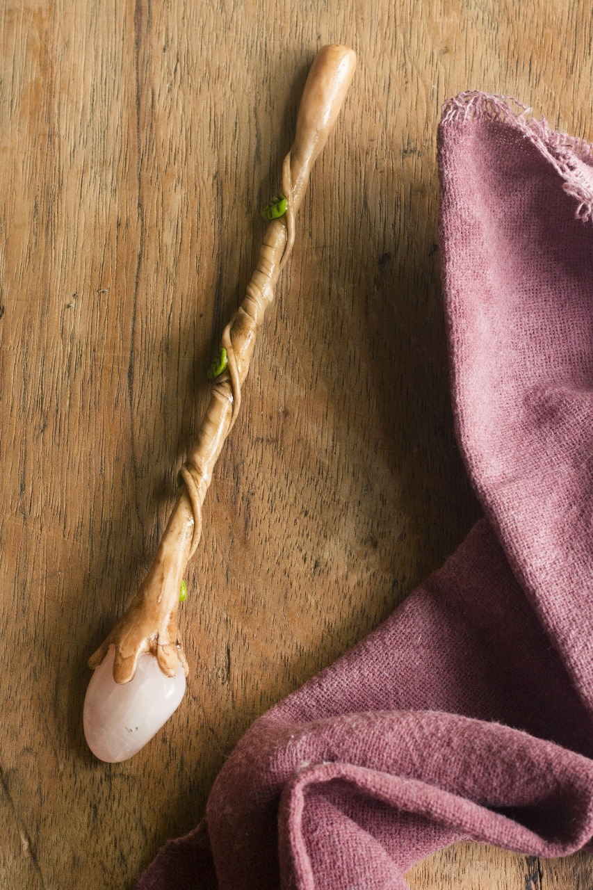 Artesanalmente moldada em biscuit, essa varinha mágica traz na ponta um cristal de Quartzo Rosa, pedra do amor, da harmonia e da energia acolhedora.