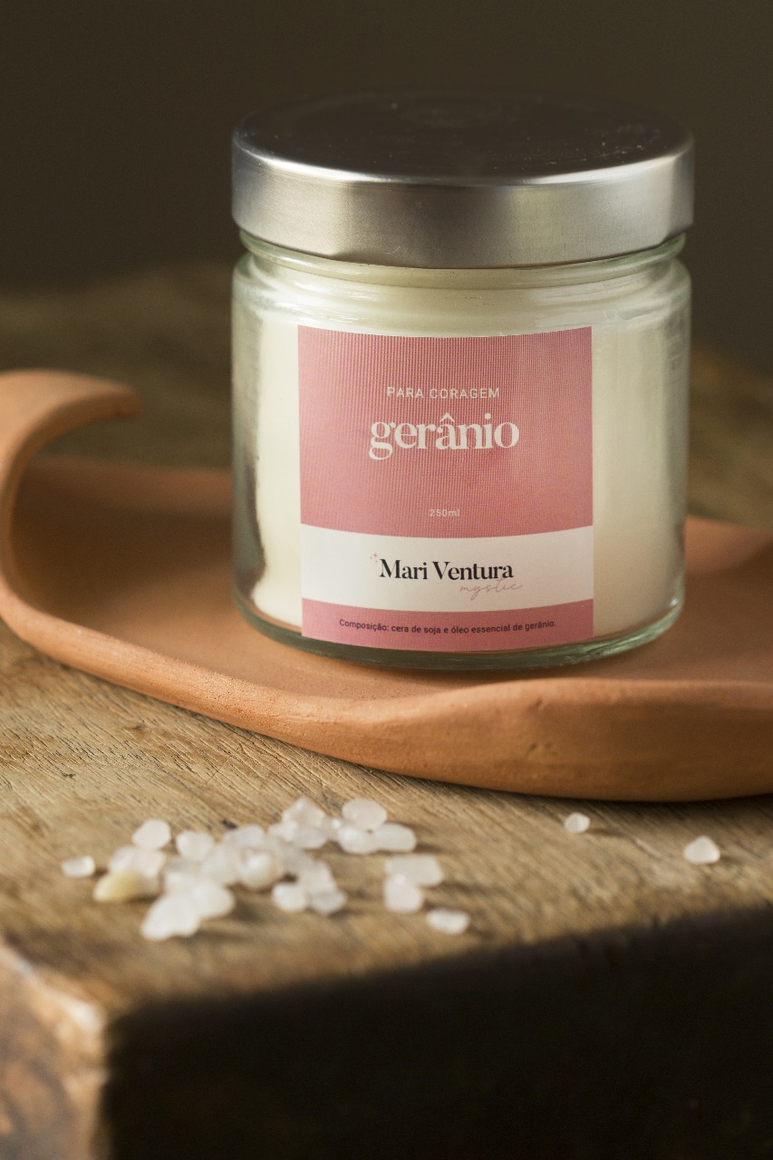 Esta vela é aromatizada com óleo essencial de gerânio, conhecido como óleo da coragem, gera estímulo para correr atrás dos seus objetivos, ter mais atitudes e lidar com os desafios do dia a dia.